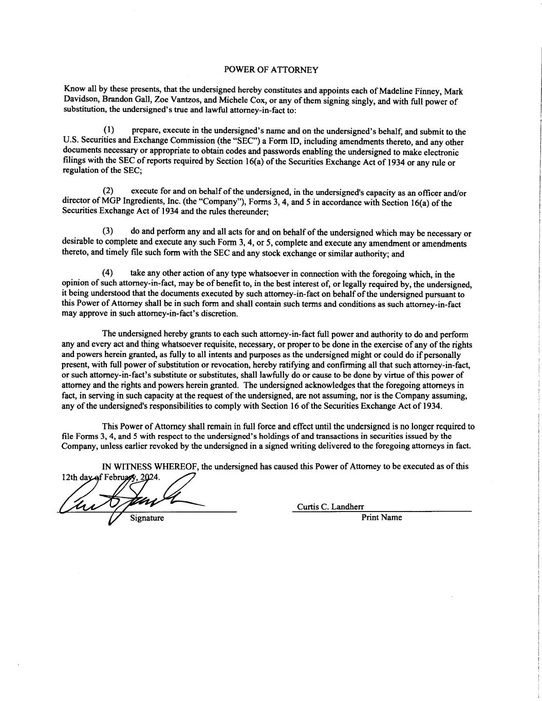 POWER OF ATTORNEY Know all by these presents, that the undersigned hereby constitutes and appoints each of Madeline Finney, Mark Davidson, Brandon Gall, Zoe Vantzos, and Michele Cox, or any of them signing singly, and with full power of substitution, the undersigned's true and lawful attorney-in-fact to: (1) prepare, execute in the undersigned's name and on the undersigned's behalf, and submit to the U.S. Securities and Exchange Commission (the "SEC") a Form ID, including amendments thereto, and any other documents necessary or appropriate to obtain codes and passwords enabling the undersigned to make electronic filings with the SEC ofreports required by Section 16(a) of the Securities Exchange Act of 1934 or any rule or regulation of the SEC; (2) execute for and on behalf of the undersigned, in the undersigned's capacity as an officer and/or director ofMGP Ingredients, Inc. (the "Company"), Forms 3, 4, and 5 in accordance with Section 16(a) of the Securities Exchange Act of 1934 and the rules thereunder; (3) do and perform any and all acts for and on behalf of the undersigned which may be necessary or desirable to complete and execute any such Form 3, 4, or 5, complete and execute any amendment or amendments thereto, and timely file such form with the SEC and any stock exchange or similar authority; and ( 4) take any other action of any type whatsoever in connection with the foregoing which, in the opinion of such attorney-in-fact, may be of benefit to, in the best interest of, or legally required by, the undersigned, it being understood that the documents executed by such attorney-in-fact on behalf of the undersigned pursuant to this Power of Attorney shall be in such form and shall contain such terms and conditions as such attorney-in-fact may approve in such attorney-in-fact's discretion. The undersigned hereby grants to each such attorney-in-fact full power and authority to do and perform any and every act and thing whatsoever requisite, necessary, or proper to be done in the exercise of any of the rights and powers herein granted, as fully to all intents and purposes as the undersigned might or could do if personally present, with full power of substitution or revocation, hereby ratifying and confirming all that such attorney-in-fact, or such attorney-in-fact's substitute or substitutes, shall lawfully do or cause to be done by virtue of this power of attorney and the rights and powers herein granted. The undersigned acknowledges that the foregoing attorneys in fact, in serving in such capacity at the request of the undersigned, are not assuming, nor is the Company assuming, any of the undersigned's responsibilities to comply with Section 16 of the Securities Exchange Act of 1934. This Power of Attorney shall remain in full force and effect until the undersigned is no longer required to file Forms 3, 4, and 5 with respect to the undersigned's holdings of and transactions in securities issued by the Company, unless earlier revoked by the undersigned in a signed writing delivered to the foregoing attorneys in fact. IN WITNESS WHEREOF, the undersigned has caused this Power of Attorney to be executed as of this fFebru , 2 4. Curtis C. Landherr Print Name