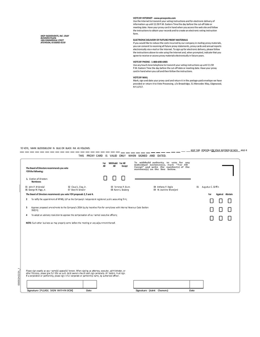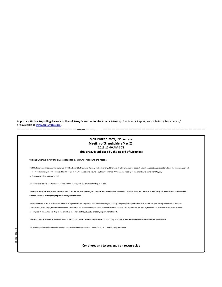 We are providing this proxy statement to you on the Internet, or upon your request, have delivered a printed version of this proxy statement to you by mailing in connection with the solicitation by the Board of Directors of MGP Ingredients, Inc. (the "Company") of proxies to be voted at our Annual Meeting of its stockholders (including any adjournment or postponement thereof) to be held on May 21, 2015.