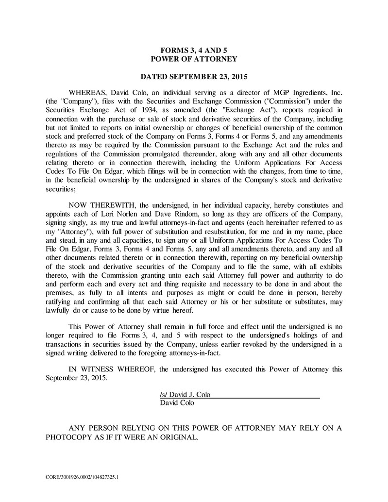 CORE/3001926.0002/104827325.1 FORMS 3, 4 AND 5 POWER OF ATTORNEY DATED SEPTEMBER 23, 2015 WHEREAS, David Colo, an individual serving as a director of MGP Ingredients, Inc. (the "Company"), files with the Securities and Exchange Commission ("Commission") under the Securities Exchange Act of 1934, as amended (the "Exchange Act"), reports required in connection with the purchase or sale of stock and derivative securities of the Company, including but not limited to reports on initial ownership or changes of beneficial ownership of the common stock and preferred stock of the Company on Forms 3, Forms 4 or Forms 5, and any amendments thereto as may be required by the Commission pursuant to the Exchange Act and the rules and regulations of the Commission promulgated thereunder, along with any and all other documents relating thereto or in connection therewith, including the Uniform Applications For Access Codes To File On Edgar, which filings will be in connection with the changes, from time to time, in the beneficial ownership by the undersigned in shares of the Company's stock and derivative securities; NOW THEREWITH, the undersigned, in her individual capacity, hereby constitutes and appoints each of Lori Norlen and Dave Rindom, so long as they are officers of the Company, signing singly, as my true and lawful attorneys-in-fact and agents (each hereinafter referred to as my "Attorney"), with full power of substitution and resubstitution, for me and in my name, place and stead, in any and all capacities, to sign any or all Uniform Applications For Access Codes To File On Edgar, Forms 3, Forms 4 and Forms 5, any and all amendments thereto, and any and all other documents related thereto or in connection therewith, reporting on my beneficial ownership of the stock and derivative securities of the Company and to file the same, with all exhibits thereto, with the Commission granting unto each said Attorney full power and authority to do and perform each and every act and thing requisite and necessary to be done in and about the premises, as fully to all intents and purposes as might or could be done in person, hereby ratifying and confirming all that each said Attorney or his or her substitute or substitutes, may lawfully do or cause to be done by virtue hereof. This Power of Attorney shall remain in full force and effect until the undersigned is no longer required to file Forms 3, 4, and 5 with respect to the undersigned's holdings of and transactions in securities issued by the Company, unless earlier revoked by the undersigned in a signed writing delivered to the foregoing attorneys-in-fact. IN WITNESS WHEREOF, the undersigned has executed this Power of Attorney this September 23, 2015. /s/ David J. Colo David Colo ANY PERSON RELYING ON THIS POWER OF ATTORNEY MAY RELY ON A PHOTOCOPY AS IF IT WERE AN ORIGINAL.