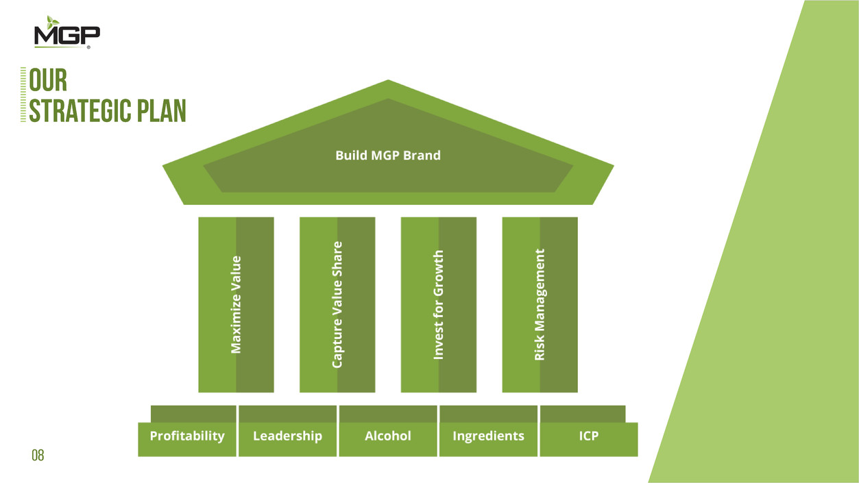 Certain of the comments made in this presentation and in the question and answer session that follows may contain forward-looking statements in relation to operations, financial condition and operating results of MGP Ingredients, Inc. and such statements involve a number of risks and uncertainties. Forward-looking statements are usually identified by or associated with such words as “intend,” ”plan,” ”believe,” ”estimate,” “expect,” “anticipate,” “hopeful,” “should,” “may,” “will,” “could,” “encouraged,” “opportunities,” “potential,” and/or the negatives or variations of these terms or similar terminology. These statements reflect management’s views as of today and we do not undertake any obligation to update them. We wish to caution you that these statements are only estimates and that actual results may differ materially from those projected in the forward-looking statements. Important factors that could cause actual results to differ materially from our expectations include, among others: (i) disruptions in operations at our Atchison facility, Indiana facility, or at the Illinois Corn Processing, LLC ("ICP") facility, (ii) the availability and cost of grain, flour, and barrels, and fluctuations in energy costs, (iii) the effectiveness of our corn purchasing program to mitigate our exposure to commodity price fluctuations, (iv) the effectiveness or execution of our five-year strategic plan, (v) potential adverse effects to operations and our system of internal controls related to the loss of key management personnel, (vi) the competitive environment and related market conditions, (vii) the ability to effectively pass raw material price increases on to customers, (viii) the positive or adverse impact to our earnings as a result of the ownership of our equity method investment in ICP and the volatility of its operating results, (ix) ICP's access to capital, (x) our limited influence over the ICP joint venture operating decisions, strategies, financial or other decisions (including investments, capital spending and distributions), (xi) our ability to source product from the ICP joint venture or unaffiliated third parties, (xii) our ability to maintain compliance with all applicable loan agreement covenants, (xiii) our ability to realize operating efficiencies, (xiv) actions of governments, (xv) consumer tastes and preferences, and (xvi) the volatility in our earnings resulting from the timing differences between a business interruption and a potential insurance recovery. Additional information concerning factors that could cause actual results to materially differ from those in the forward-looking statements is contained in Item 1A Risk Factors of our Annual Report on Form 10-K for the period ending December 31, 2015.