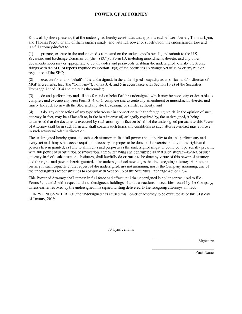 POWER OF ATTORNEY Know all by these presents, that the undersigned hereby constitutes and appoints each of Lori Norlen, Thomas Lynn, and Thomas Pigott, or any of them signing singly, and with full power of substitution, the undersigned's true and lawful attorney-in-fact to: (1) prepare, execute in the undersigned’s name and on the undersigned’s behalf, and submit to the U.S. Securities and Exchange Commission (the “SEC”) a Form ID, including amendments thereto, and any other documents necessary or appropriate to obtain codes and passwords enabling the undersigned to make electronic filings with the SEC of reports required by Section 16(a) of the Securities Exchange Act of 1934 or any rule or regulation of the SEC; (2) execute for and on behalf of the undersigned, in the undersigned's capacity as an officer and/or director of MGP Ingredients, Inc. (the “Company”), Forms 3, 4, and 5 in accordance with Section 16(a) of the Securities Exchange Act of 1934 and the rules thereunder; (3) do and perform any and all acts for and on behalf of the undersigned which may be necessary or desirable to complete and execute any such Form 3, 4, or 5, complete and execute any amendment or amendments thereto, and timely file such form with the SEC and any stock exchange or similar authority; and (4) take any other action of any type whatsoever in connection with the foregoing which, in the opinion of such attorney-in-fact, may be of benefit to, in the best interest of, or legally required by, the undersigned, it being understood that the documents executed by such attorney-in-fact on behalf of the undersigned pursuant to this Power of Attorney shall be in such form and shall contain such terms and conditions as such attorney-in-fact may approve in such attorney-in-fact's discretion. The undersigned hereby grants to each such attorney-in-fact full power and authority to do and perform any and every act and thing whatsoever requisite, necessary, or proper to be done in the exercise of any of the rights and powers herein granted, as fully to all intents and purposes as the undersigned might or could do if personally present, with full power of substitution or revocation, hereby ratifying and confirming all that such attorney-in-fact, or such attorney-in-fact's substitute or substitutes, shall lawfully do or cause to be done by virtue of this power of attorney and the rights and powers herein granted. The undersigned acknowledges that the foregoing attorneys in fact, in serving in such capacity at the request of the undersigned, are not assuming, nor is the Company assuming, any of the undersigned's responsibilities to comply with Section 16 of the Securities Exchange Act of 1934. This Power of Attorney shall remain in full force and effect until the undersigned is no longer required to file Forms 3, 4, and 5 with respect to the undersigned's holdings of and transactions in securities issued by the Company, unless earlier revoked by the undersigned in a signed writing delivered to the foregoing attorneys in fact. IN WITNESS WHEREOF, the undersigned has caused this Power of Attorney to be executed as of this 31st day of January, 2019. /s/ Lynn Jenkins _______________________________ Signature _______________________________ Print Name